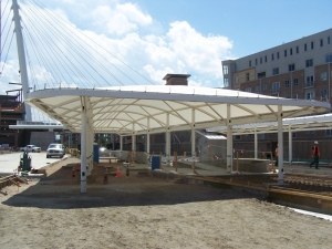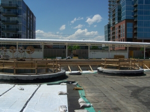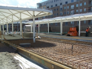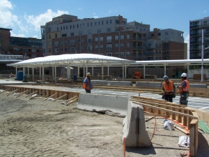Secondly, the new light rail and mall shuttle stations at Denver Union Station will open in mid-August, serving as the first major components of the $500 million project to be open to the public. The new station is located just north and east of the Millennium Bridge along the Consolidated Mainline (CML) tracks on the 17th Street alignment. The mall shuttle turn around will be located at the southwestern end of the new light rail platform. Both of these stations will open on August 14. Below are some pictures I snagged a few weeks back on a construction tour. More info on all of the construction at Denver Union Station can be found in Rick’s posts at the DenverInfill Blog – he’s done a great job keeping us all up to date on what’s been going on down there.